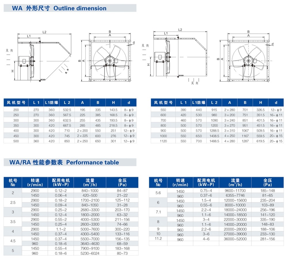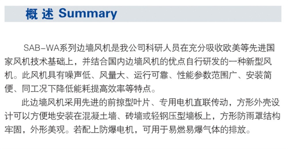 SAB-WA系列边墙风机是我公司科研人员在充分吸收欧美等先进国家风机技术基础上,并结合国内边墙风机的优点自行研发的一种新型风机。此风机具有噪声低、风量大、运行可靠、性能参数范围广、安装简便、同工况下降低能耗提高效率等特点。 此边墙风机采用先进的前掠型叶片、专用电机直联传动,方形外壳设计可以方便地安装在混凝土墙、砖墙或轻钢压型墙板上,方形防雨罩结构牢固,外形美观。若配上防爆电机,可用于易燃易爆气体的排放。