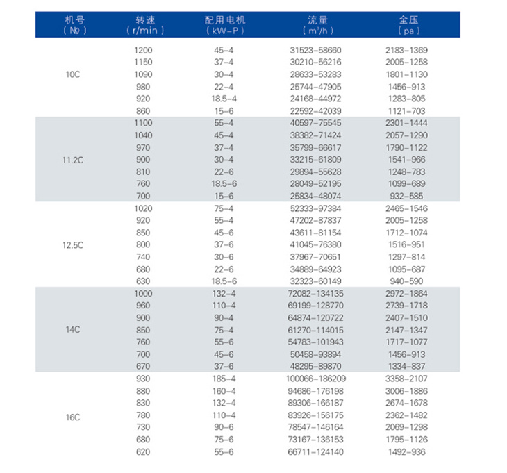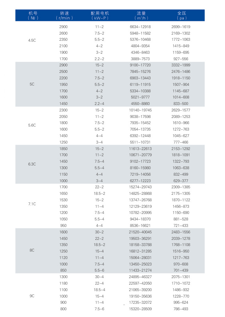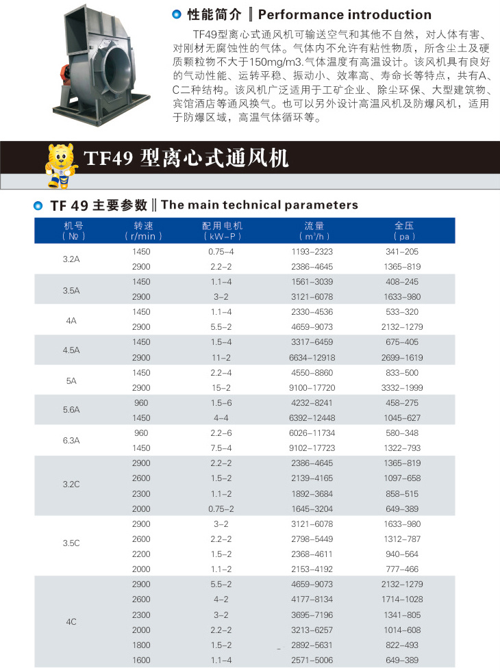 SYDF49结构上设有A式、C式、D式等传动方式。标准系列规格从400~2000共15个机号,机壳部出厂时出风口可制成0°、45°、90°、135°、180°共5种,并根据用户需要通过调整机壳部侧板上等分孔进行不同角度的适当微调。由于性能理想、结构紧凑、安装维护方便,故可广泛用于环保除尘、火核发电、冶金、石化及汽车涂装、水泥建筑等行业各种工业气体输送。C、D式带散热叶轮时适用于不超过200℃温度下的炉窑、燃烧器及高温气体循环。特殊按需亦可制成外壳保温风机。