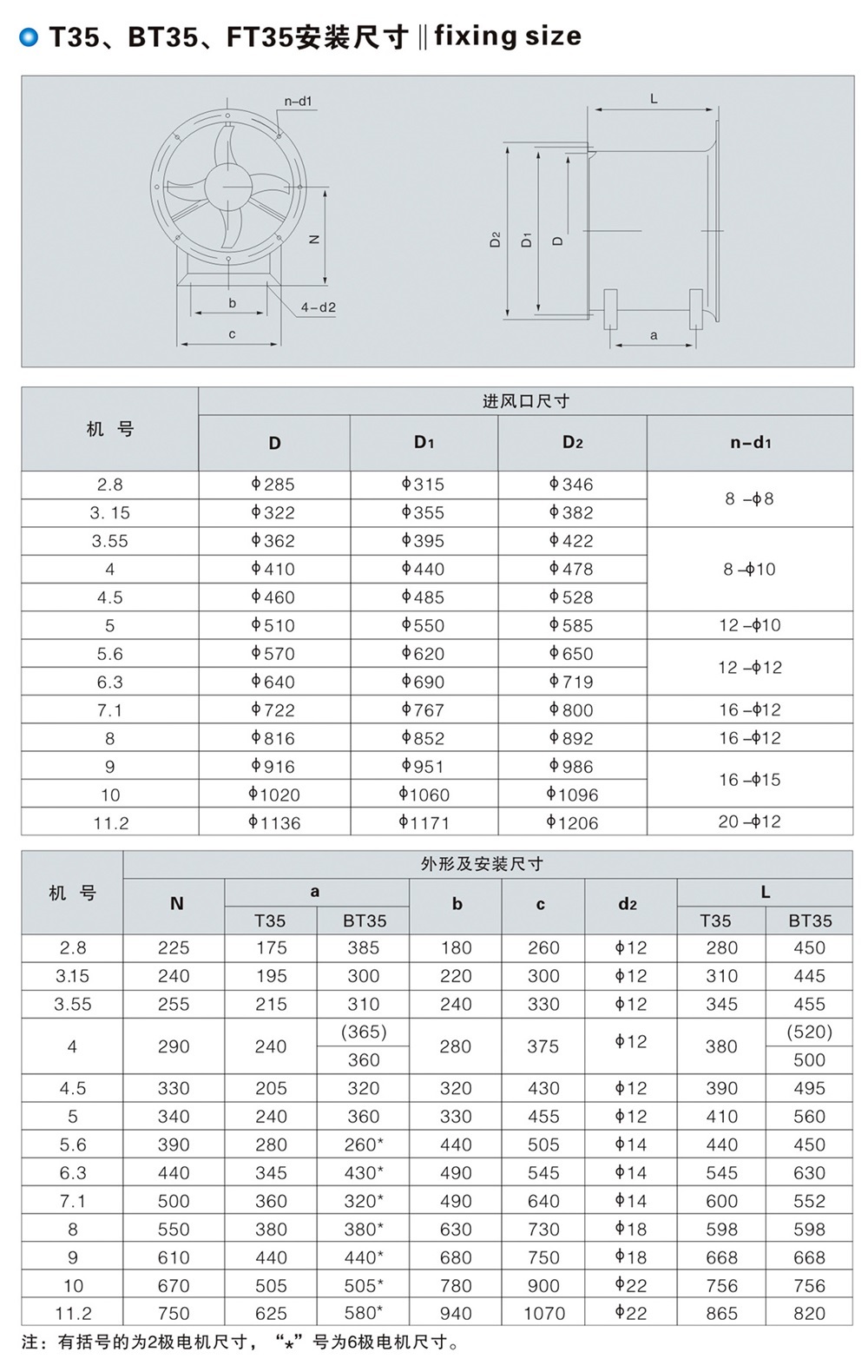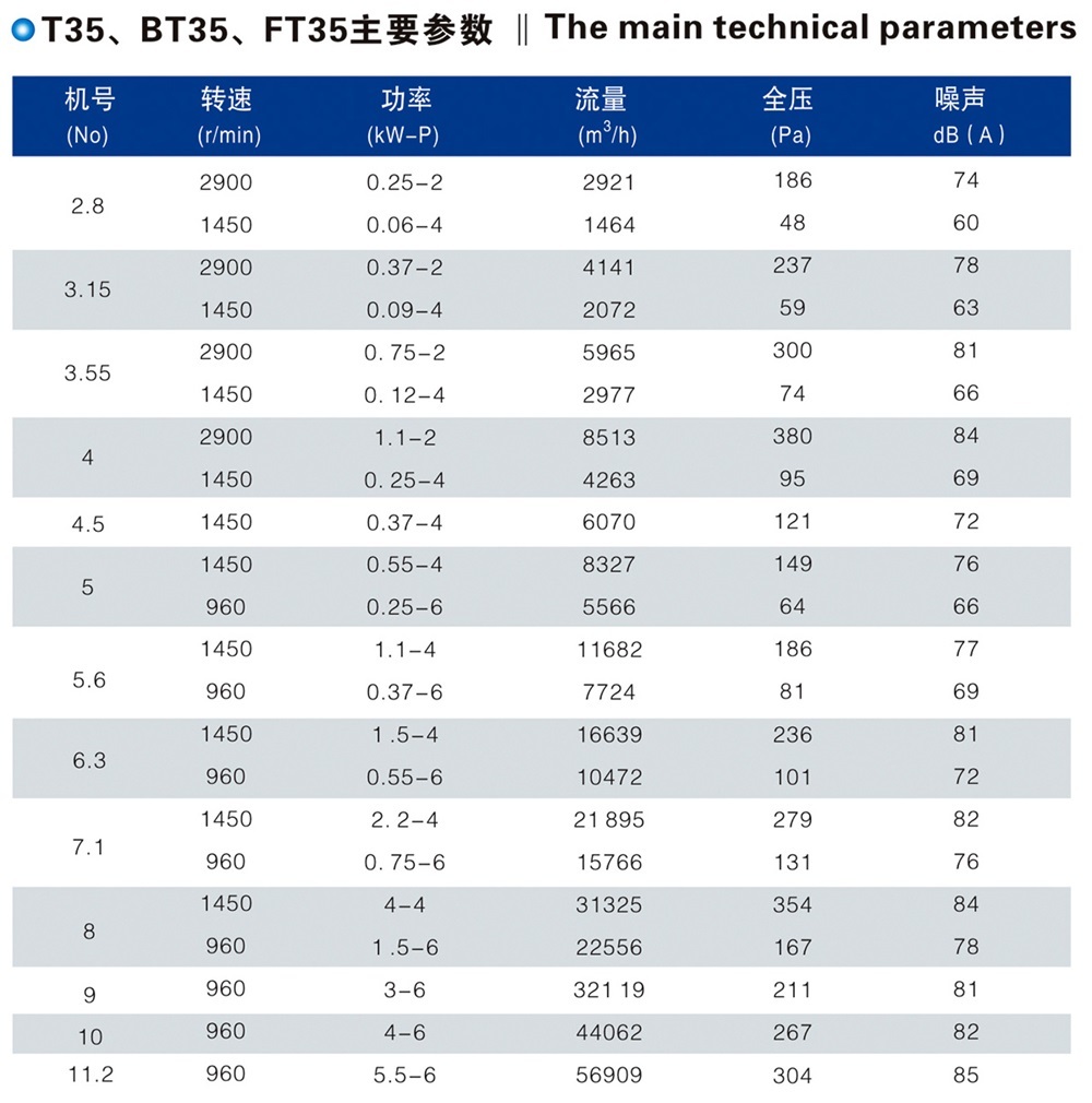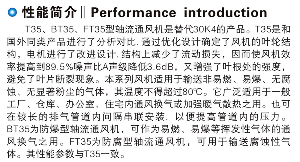 T35、BT35、FT35型轴流通风机是替代30K4的产品。T35是和国外同类产品进行了分析对比. 通过优化设计确定了风机的叶轮结构,电机进行了改进设计. 结构上减少了流动损失,因而使风机效率提高到89.5%噪声比A声级降低3.6dB,又增强了叶根处的强度,避免了叶片断裂现象。本系列风机适用于输送非易燃、易爆、无腐蚀、无显著粉尘的气体,其温度不得超过80℃。它广泛适用于一般工厂、仓库、办公室、住宅内通风换气或加强暖气散热之用。也可在较长的排气管道内间隔串联安装. 以便提高管道内的压力。BT35为防爆型轴流通风机,可作为易燃、易爆等挥发性气体的通风换气之用。FT35为防腐型轴流通风机,可用于输送腐蚀性气体。其性能参数与T35一致。