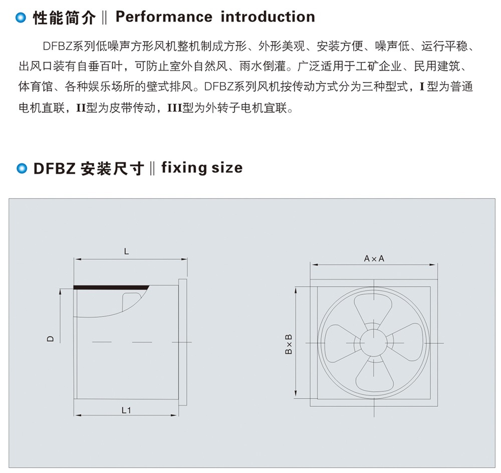 DFBZ系列低噪声方形风机整机制成方形、外形美观、安装方便、噪声低、运行平稳、出风口装有自垂百叶,可防止室外自然风、雨水倒灌。广泛适用于工矿企业、民用建筑、体育馆、各种娱乐场所的壁式排风。DFBZ系列风机按传动方式分为两种型式,I 型为普通电机直联,II型为皮带传动。