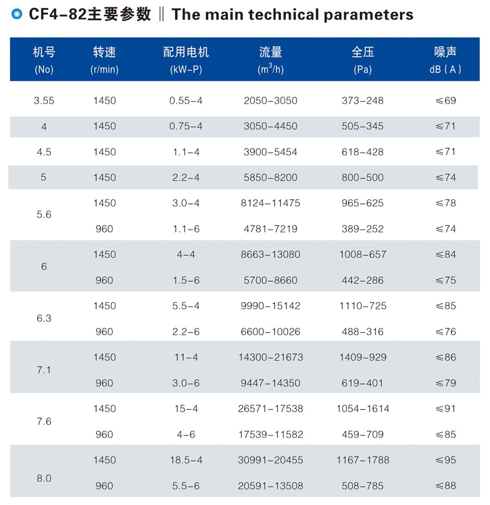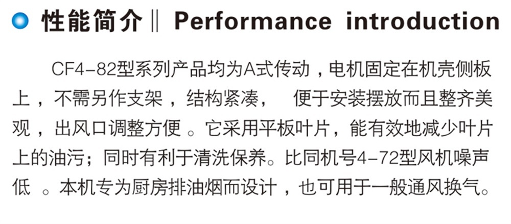 CF4-82型系列产品均为A式传动,电机固定在机壳侧板上,不需另作支架,结构紧凑,便于安装摆放而且整齐美观,出风口调整方便。它采用平板叶片,能有效地减少叶片上的油污;同时有利于清洗保养。比同机号4-72型风机噪声低。本机专为厨房排油烟而设计,也可用于一般通风换气。